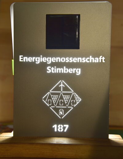 So sieht die Mitgliederplakette aus. Lasergeschnittenes, lackiertes Edelstahl. Mit aufgeklebtem Solarpanel (ohne weitere Funktion)